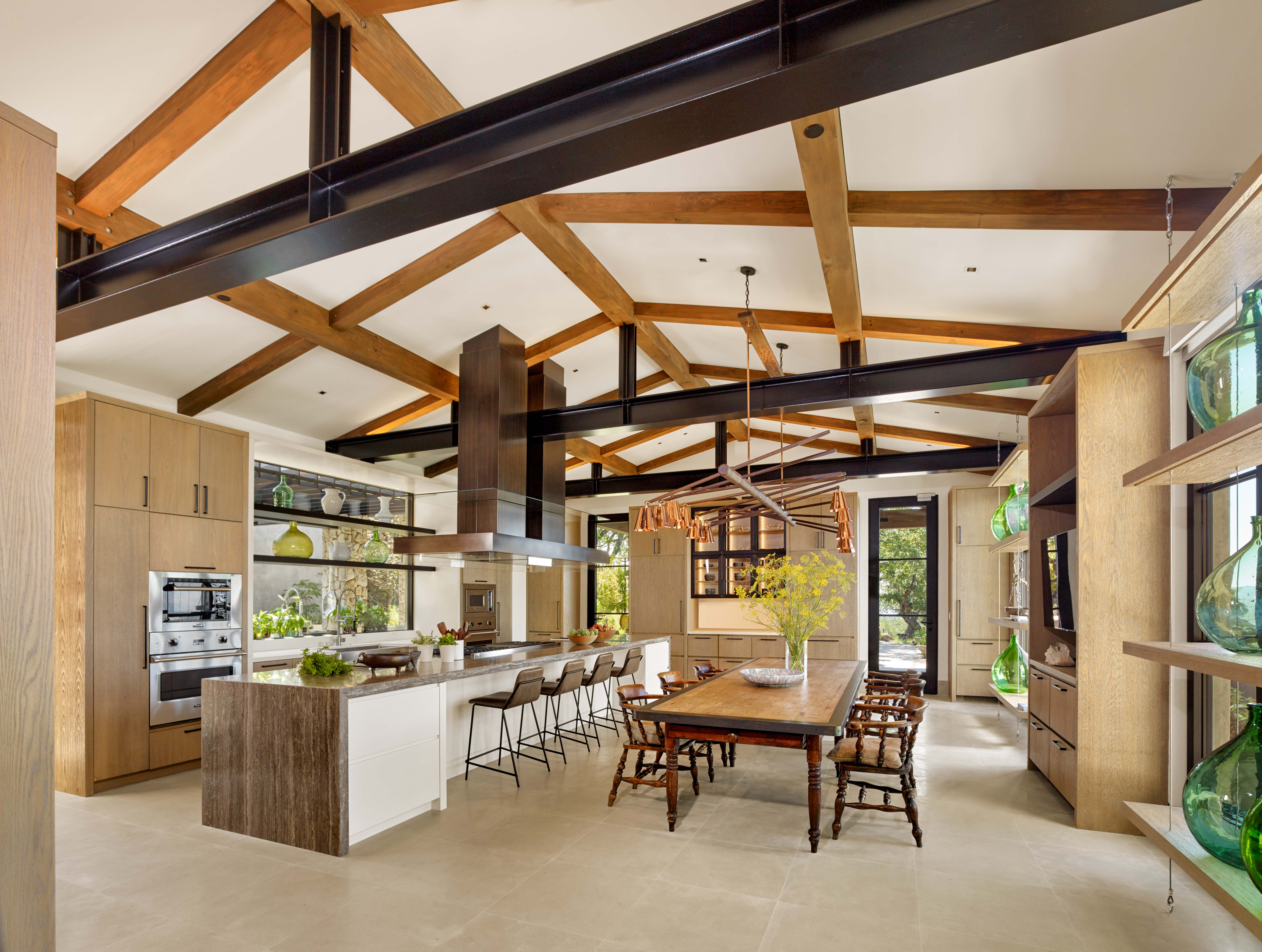 The museum-quality art collection shaped every decision. An enormous Ai Weiwei sculpture stands off-center in the reflecting pool. At the property's edge, monumental wire heads by Jaume Plensa create volume without blocking views—sculptures that remarkably may have helped save the home when the Glass Fire swept through the following year, stopping at the retaining wall beneath that terrace. We balanced contemporary pieces with carefully selected antiques, mixing Old World character with custom designs.