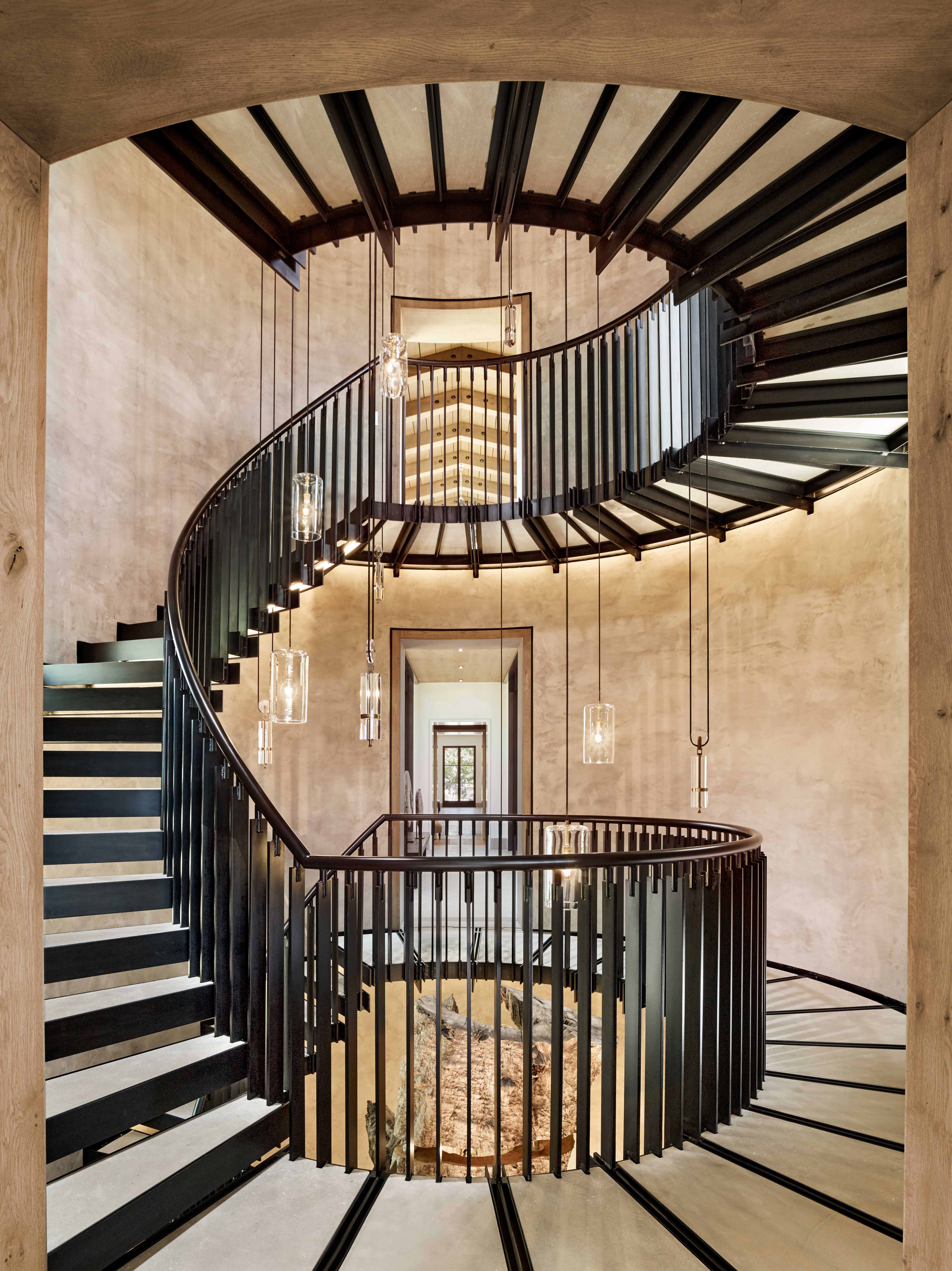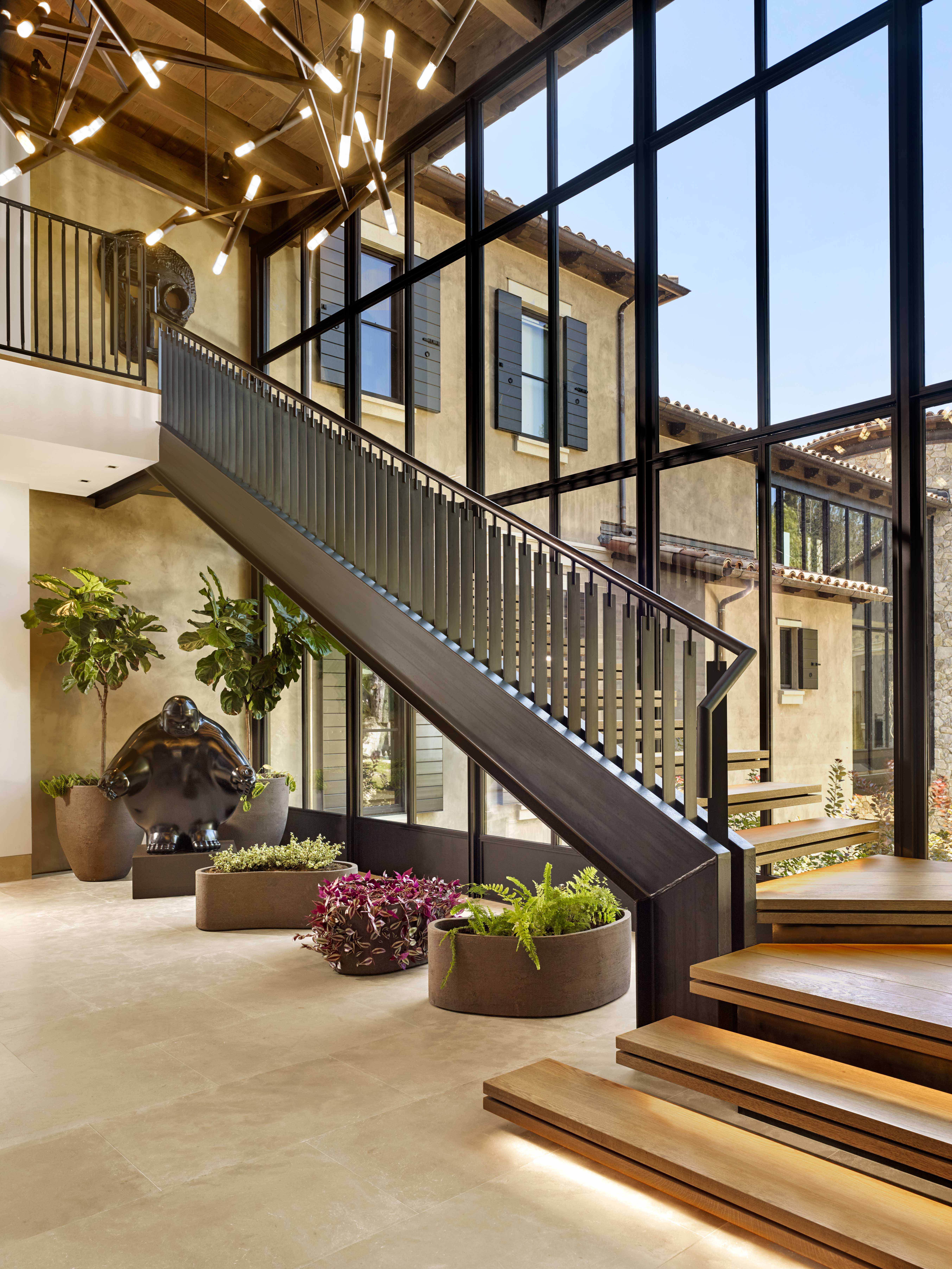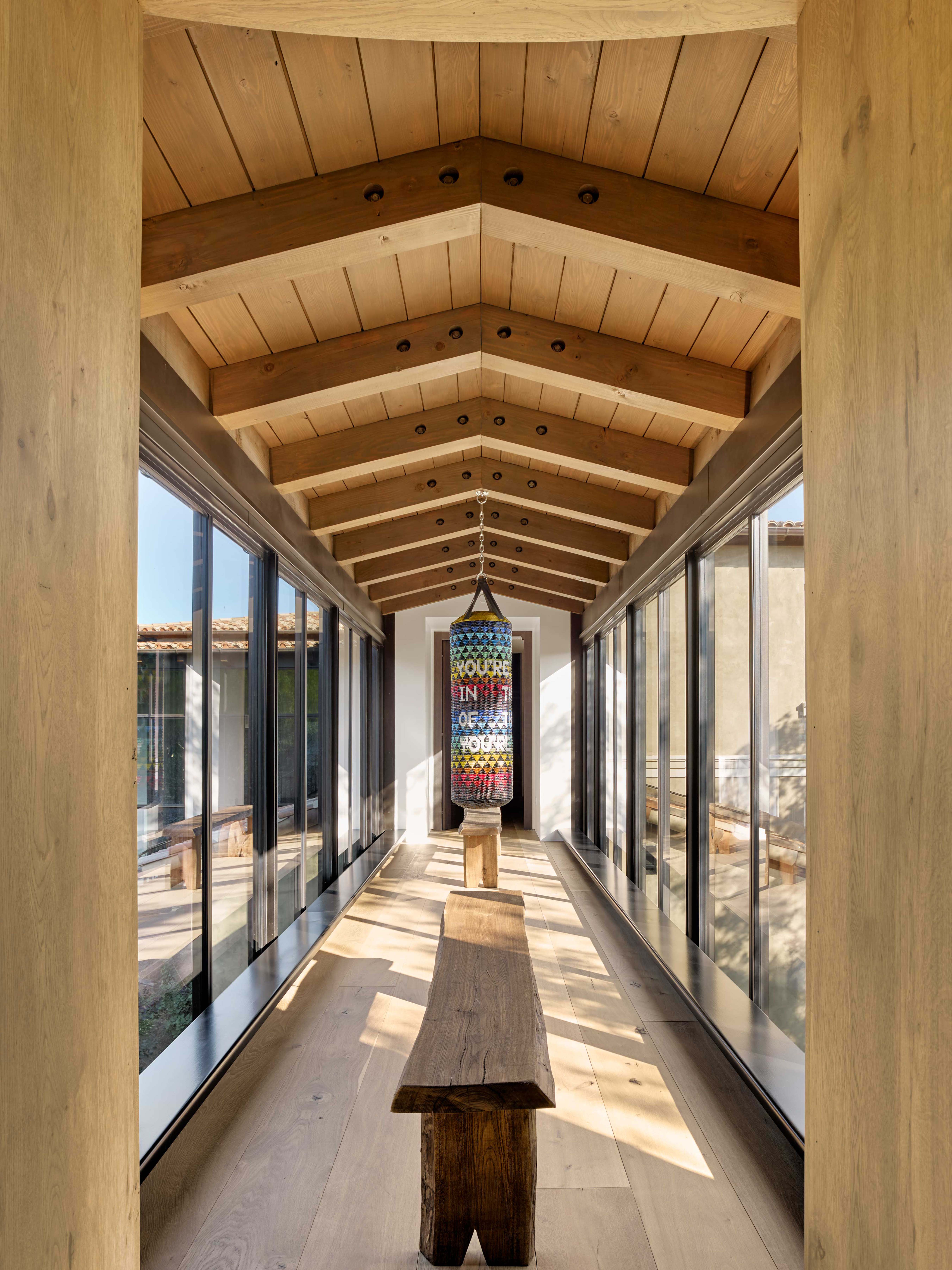 When a family you've worked with for over two decades acquires a 44-acre Napa Valley property with sweeping views obscured by a warren of dark rooms, the project becomes about revelation, opening the home to its landscape while creating a gathering place worthy of multiple generations and a world-class art collection. The original Mediterranean-style house suffered from a predictable formula: almost every room had a fireplace dead center with windows on either side, obstructing the paramount views of the valley. Working with architect Thomas Weber of The Weber Studio—who had designed the family's primary Miami residence—and Signum Architecture in St. Helena, we conceived a total transformation. Glass became the transitional element between traditional stone and stucco structures. The most arresting spatial moment is the two-level glass bridge floating twelve feet above ground, connecting to a stone turret housing a spiral staircase. Inside, an Alison Berger lighting fixture spans three stories—sculpture as much as illumination.