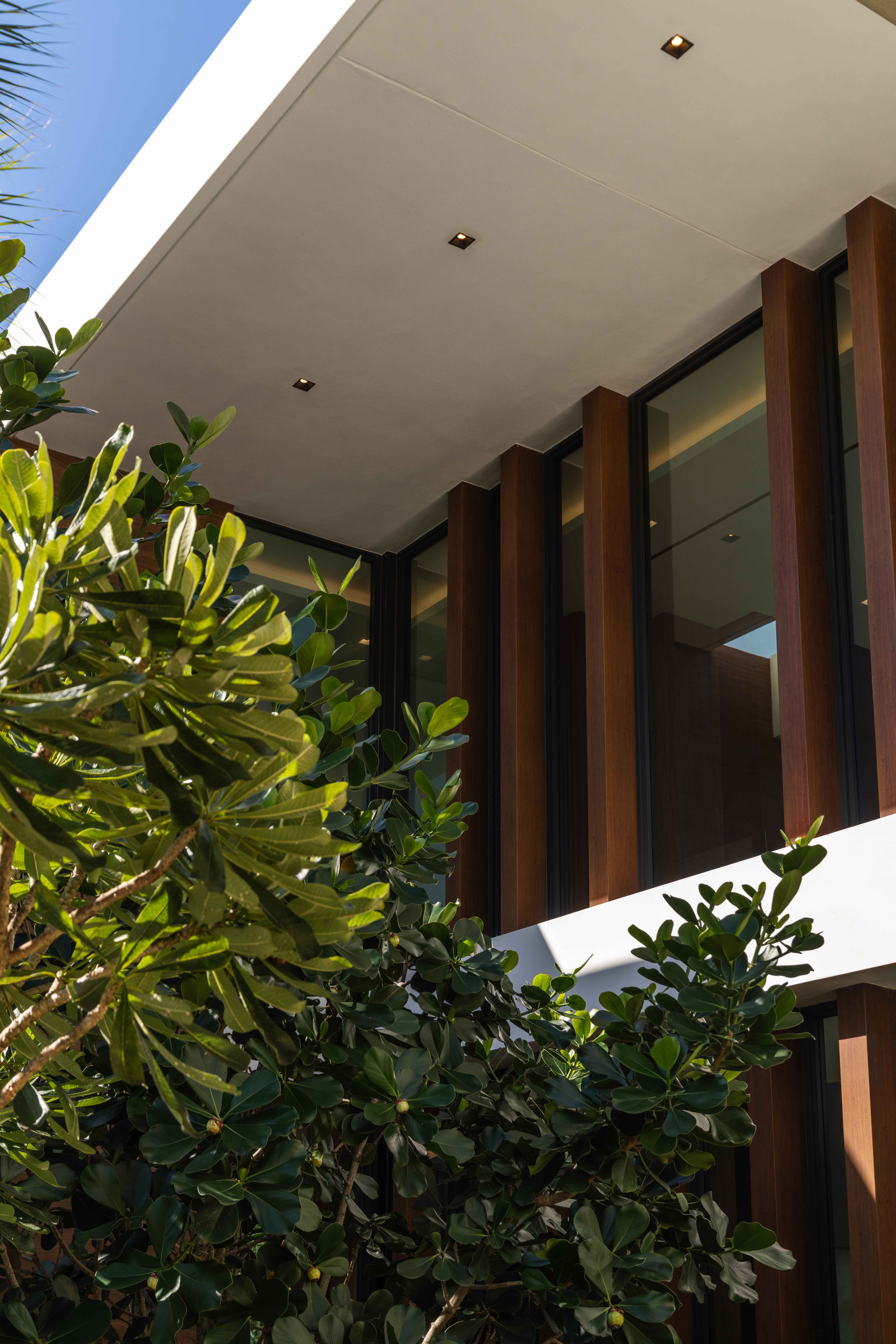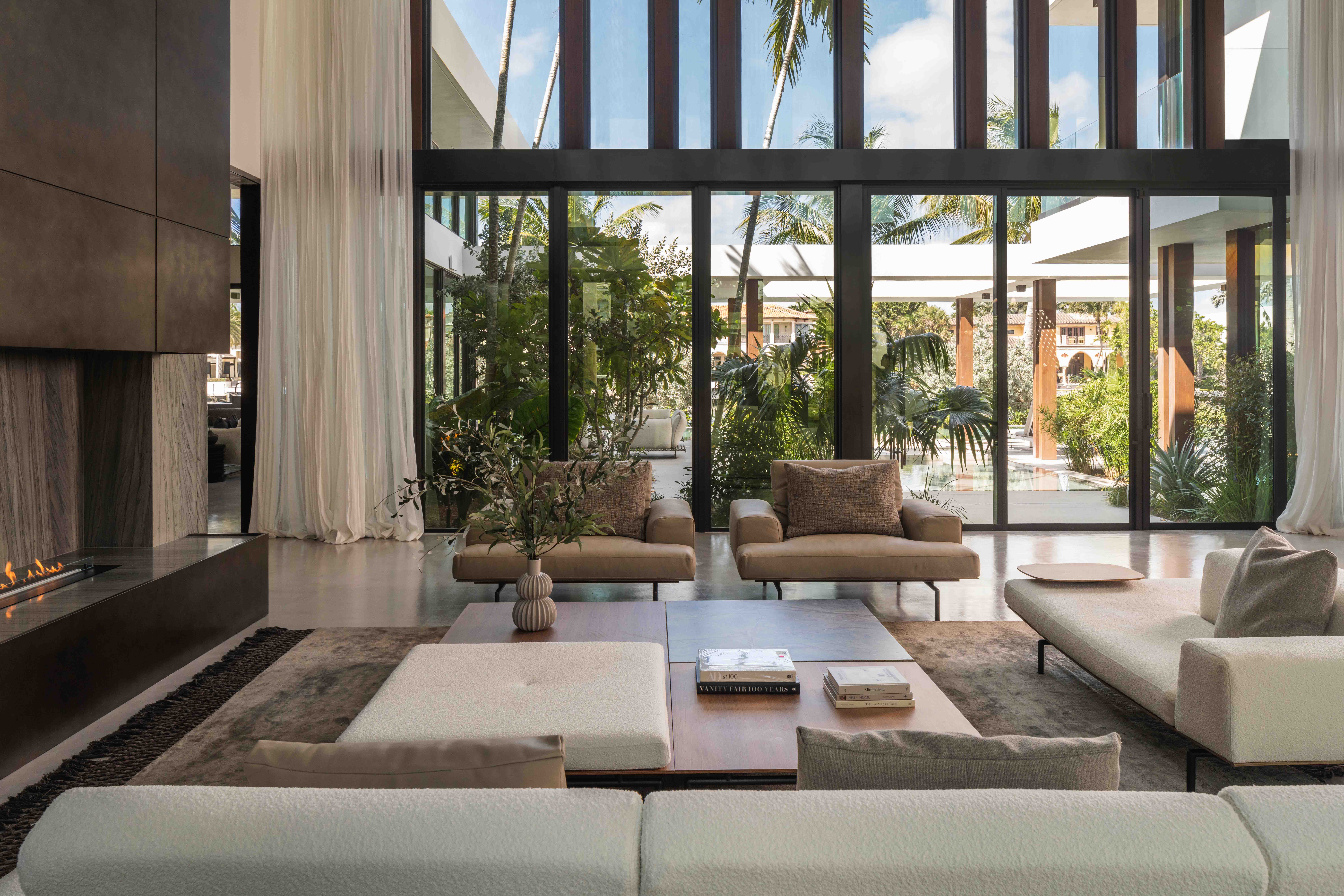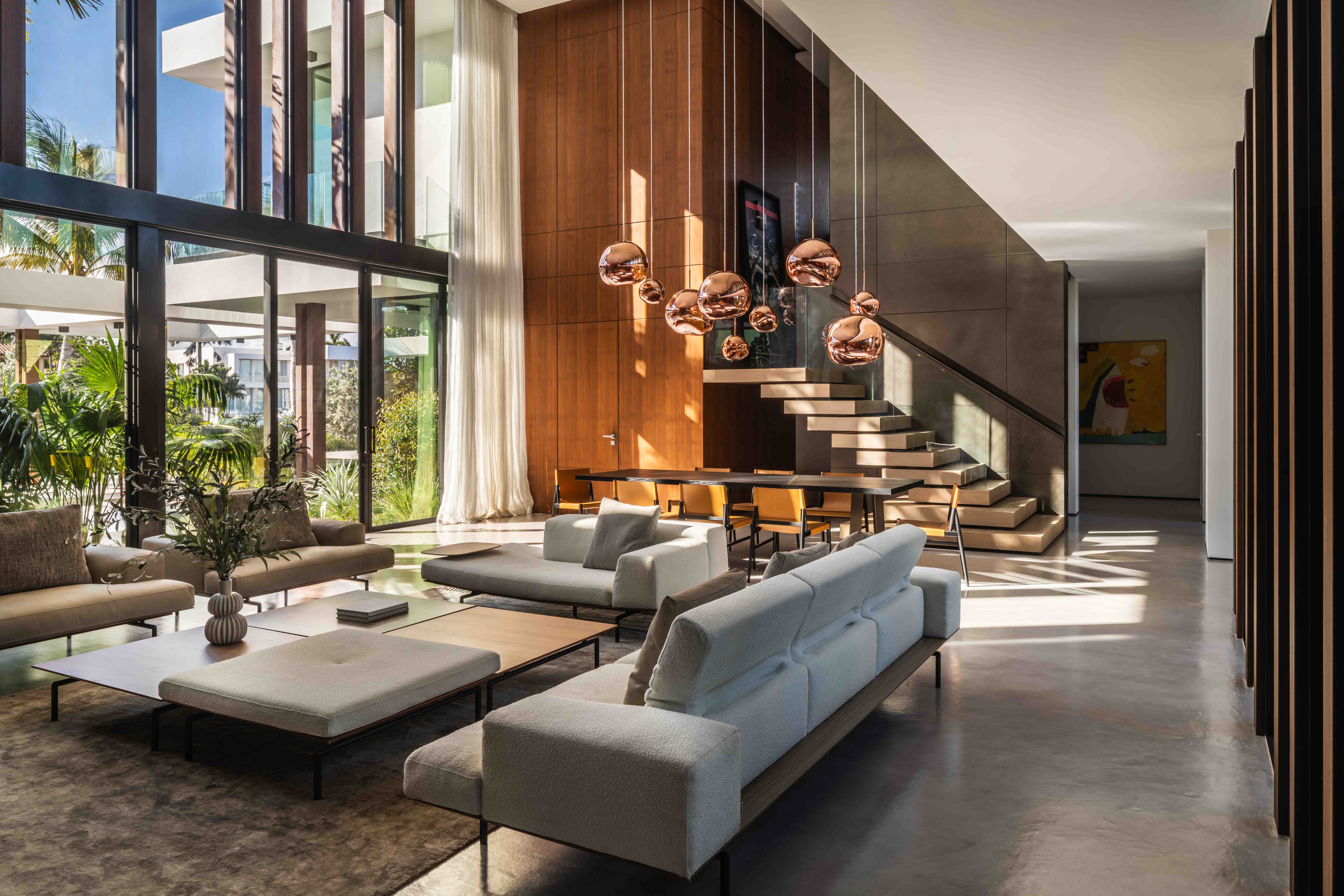 An 8,100-square-foot waterfront home on Boca Raton's Intracoastal presented an unusual brief: create something undeniably modern and masculine without alienating the neighborhood's more traditional sensibilities. The owner favored uncompromising modernism: exposed concrete, industrial materials, dark tones, and moody architectural spaces with little interest in softening edges. Our challenge became tempering those hard surfaces without diluting his vision, bringing warmth and texture to balance concrete's coolness while honoring his minimalist taste.