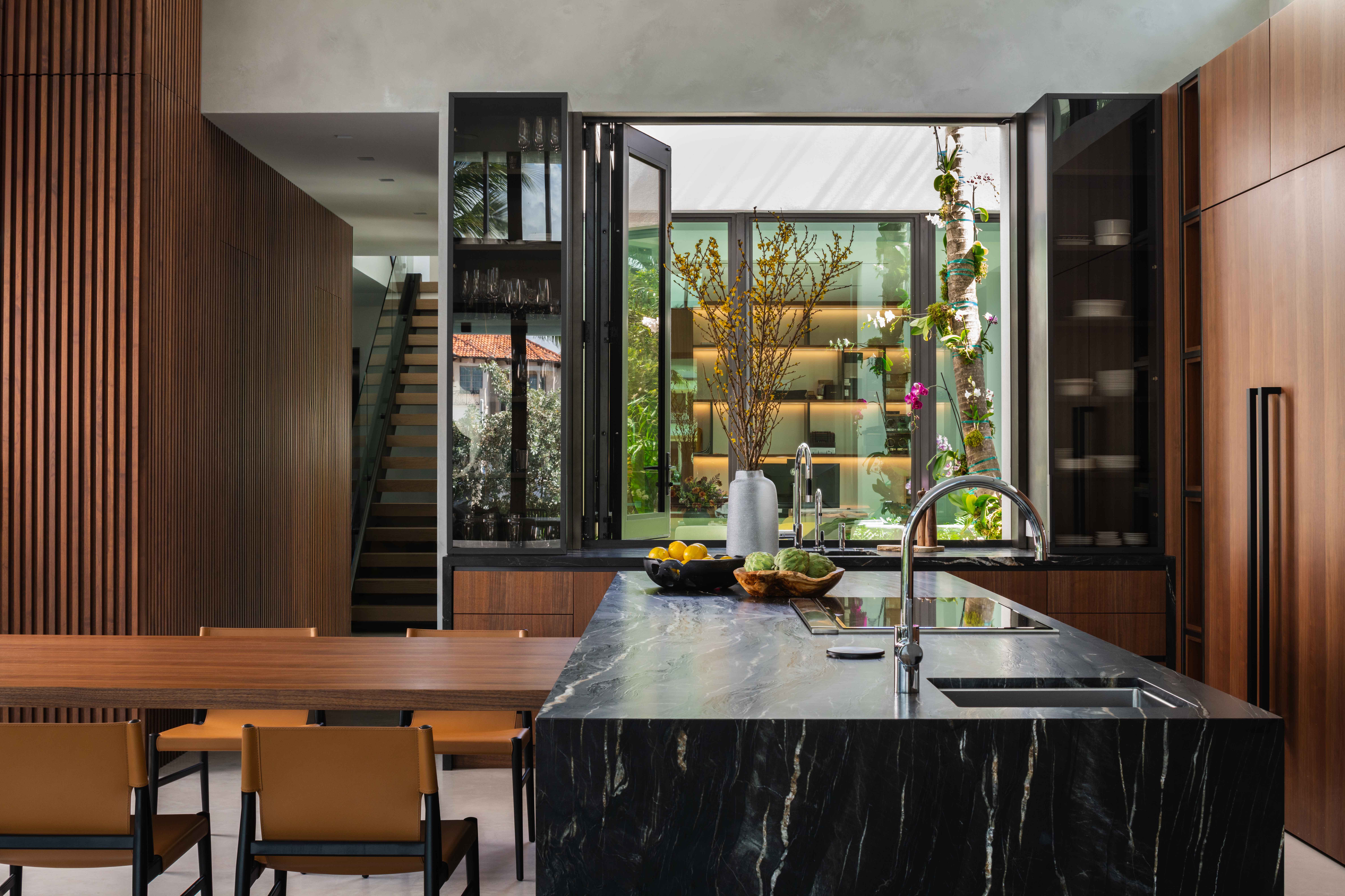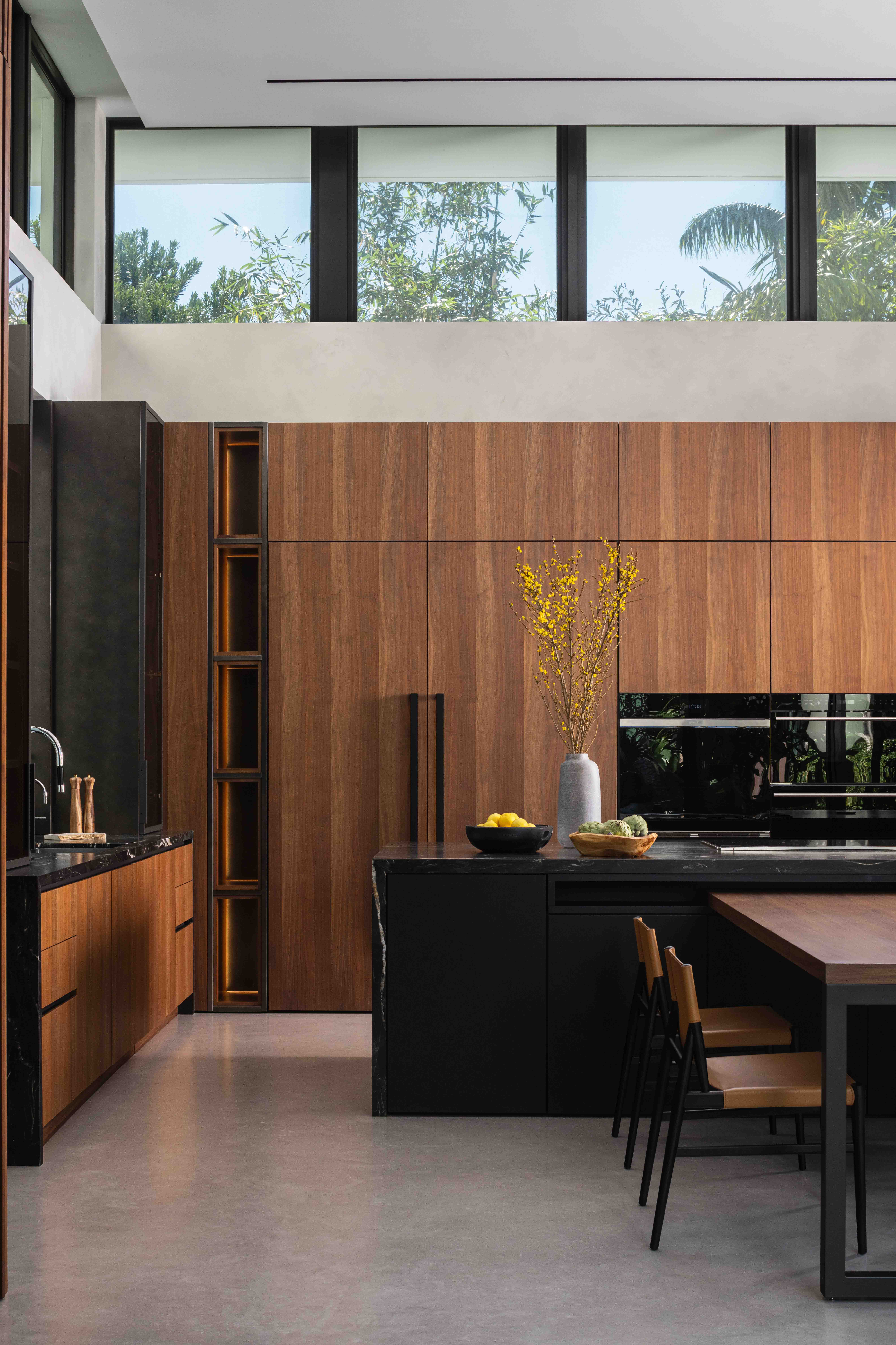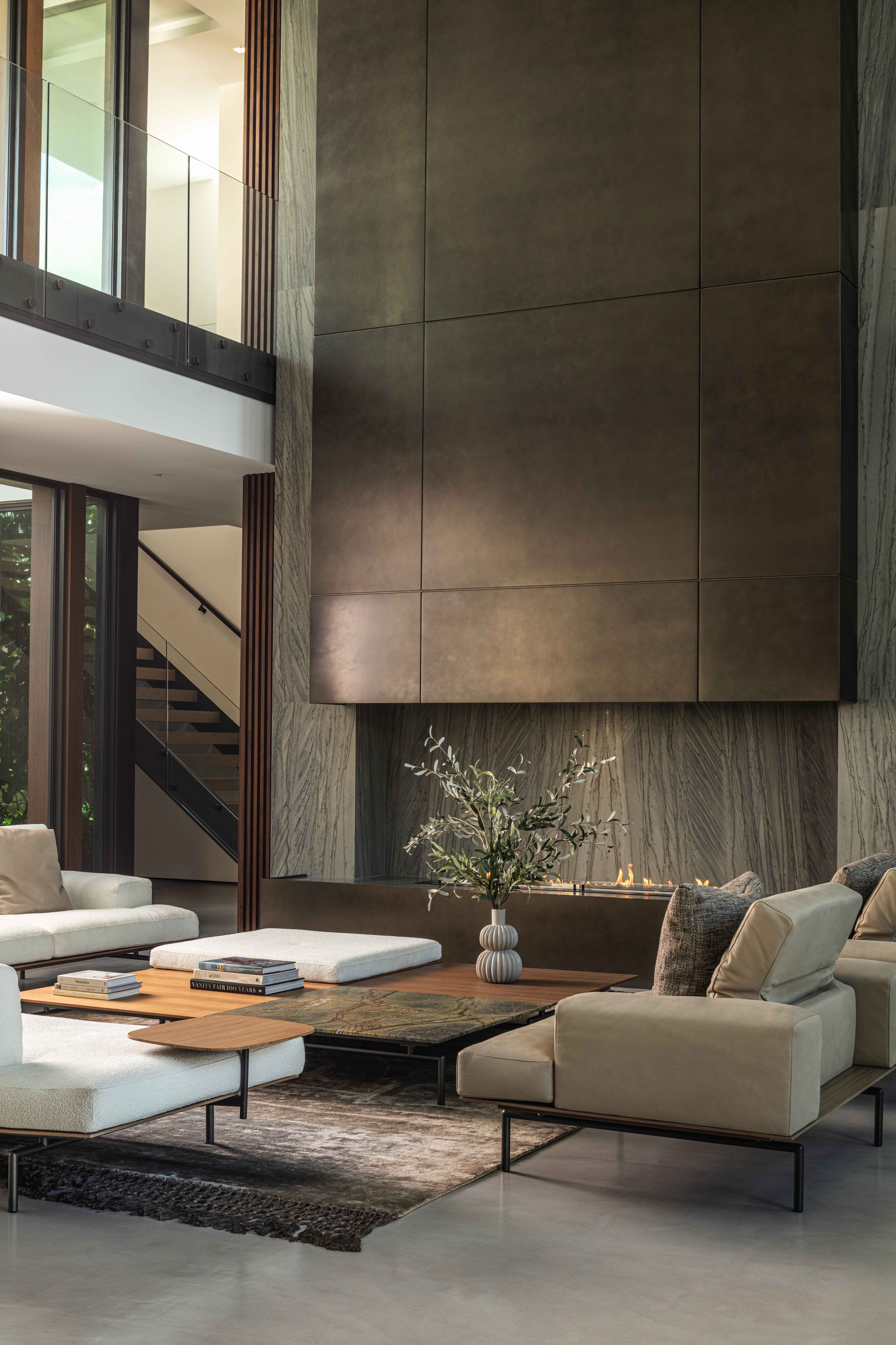 Working closely with architect Jose Sanchez of Praxis Architecture and builder Terry Paterson, we developed a material palette that played contrasts against each other. Concrete floors flow throughout the main living level, with concrete walls anchoring the primary bedroom and kitchen. These non-negotiable elements established the home's industrial character. We introduced walnut millwork in the double-height living area and picketed wood paneling near the kitchen as warm, tactile counterpoints. A bronzy metallic panel wraps the chimney flue like a work of art, its painterly layers engaging the eye while maintaining crisp lines. Italia Design Lab executed cabinetry that honored the home's architectural rigor. The floating staircase features oak treads, while the primary bath includes a Vulcan marble vanity and louvered screen overlooking a Zen garden enclosed by oolite limestone. Every detail was meticulously resolved with concealed doors and seamless transitions to preserve visual simplicity.