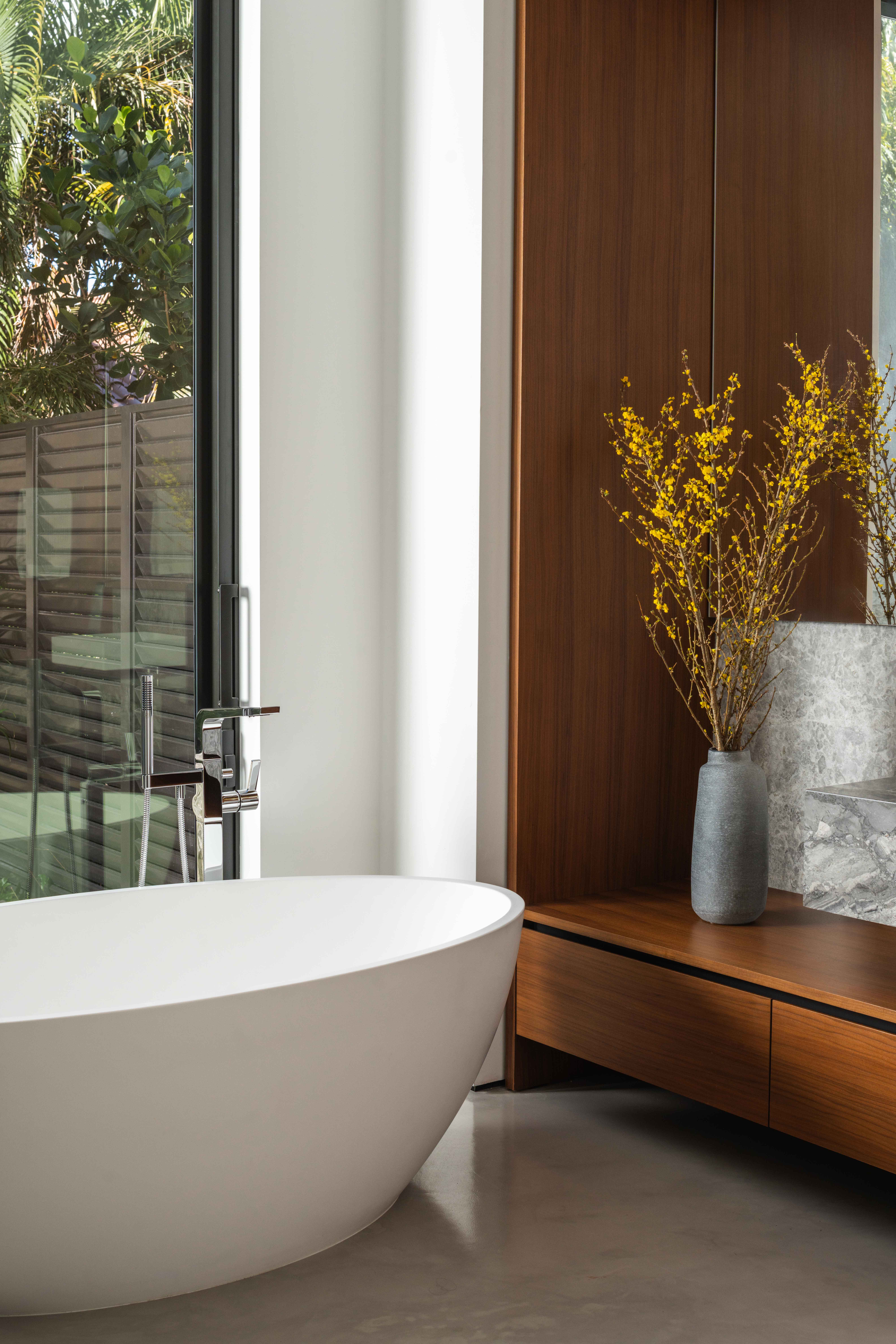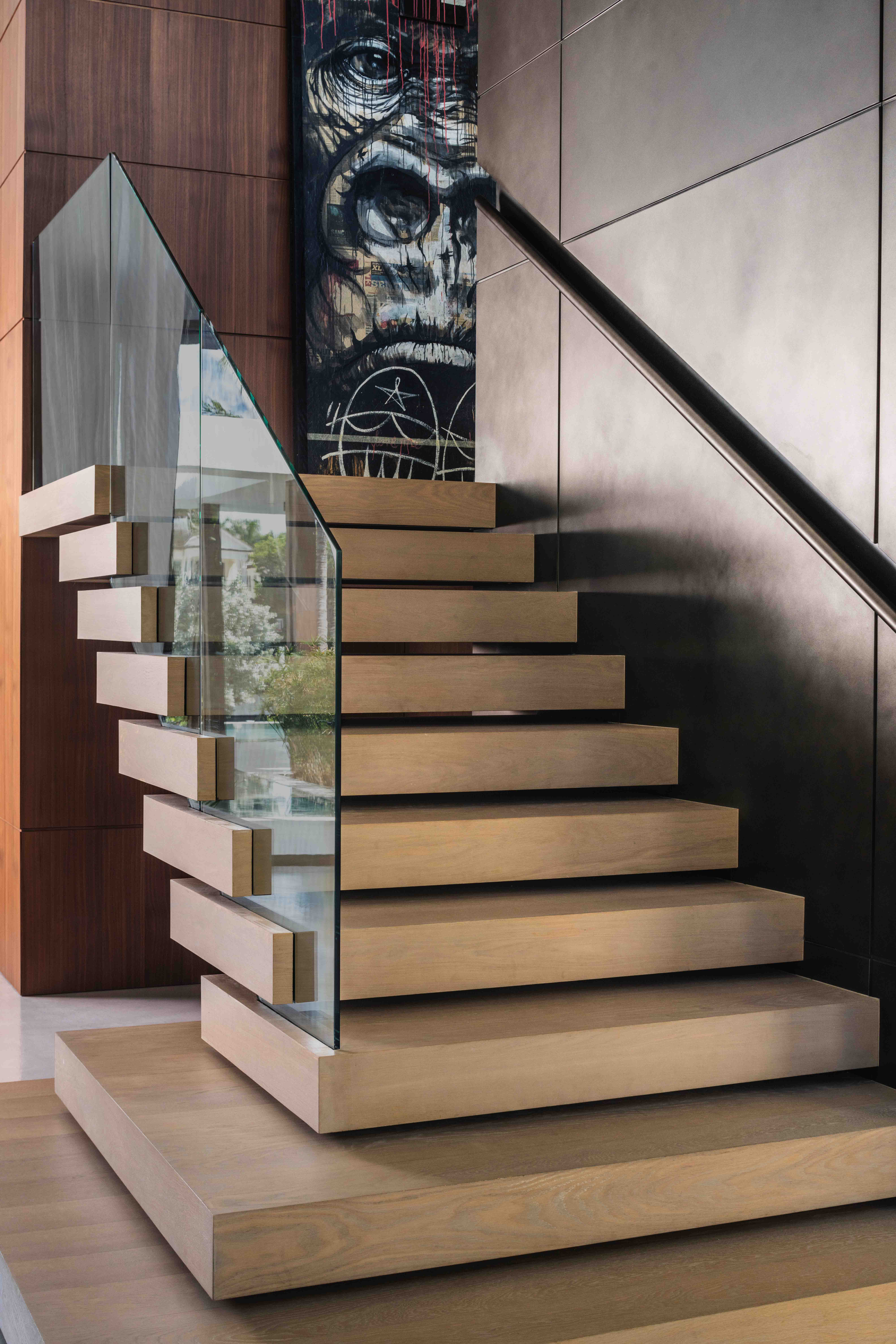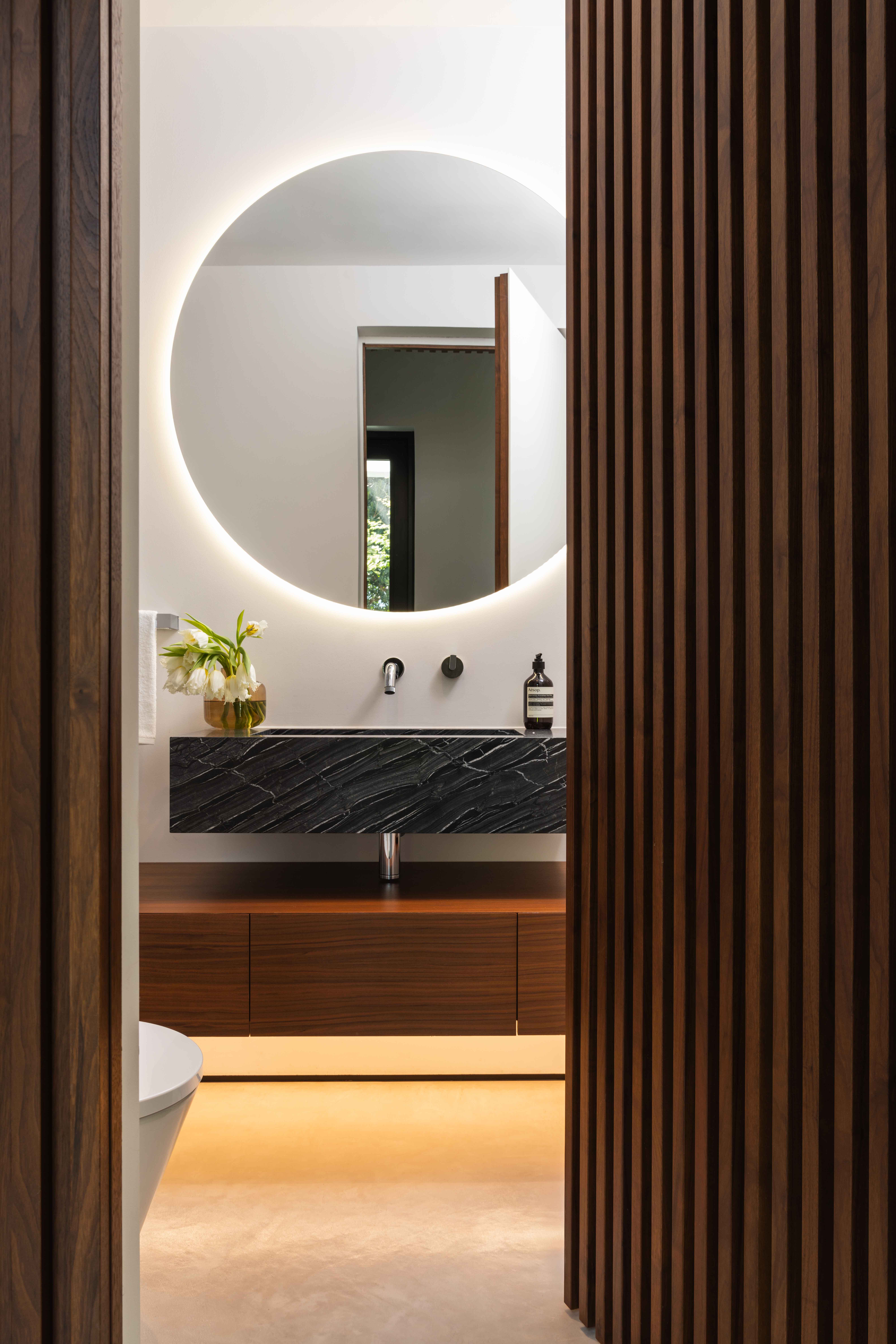 Working closely with architect Jose Sanchez of Praxis Architecture and builder Terry Paterson, we developed a material palette that played contrasts against each other. Concrete floors flow throughout the main living level, with concrete walls anchoring the primary bedroom and kitchen. These non-negotiable elements established the home's industrial character. We introduced walnut millwork in the double-height living area and picketed wood paneling near the kitchen as warm, tactile counterpoints. A bronzy metallic panel wraps the chimney flue like a work of art, its painterly layers engaging the eye while maintaining crisp lines. Italia Design Lab executed cabinetry that honored the home's architectural rigor. The floating staircase features oak treads, while the primary bath includes a Vulcan marble vanity and louvered screen overlooking a Zen garden enclosed by oolite limestone. Every detail was meticulously resolved with concealed doors and seamless transitions to preserve visual simplicity.