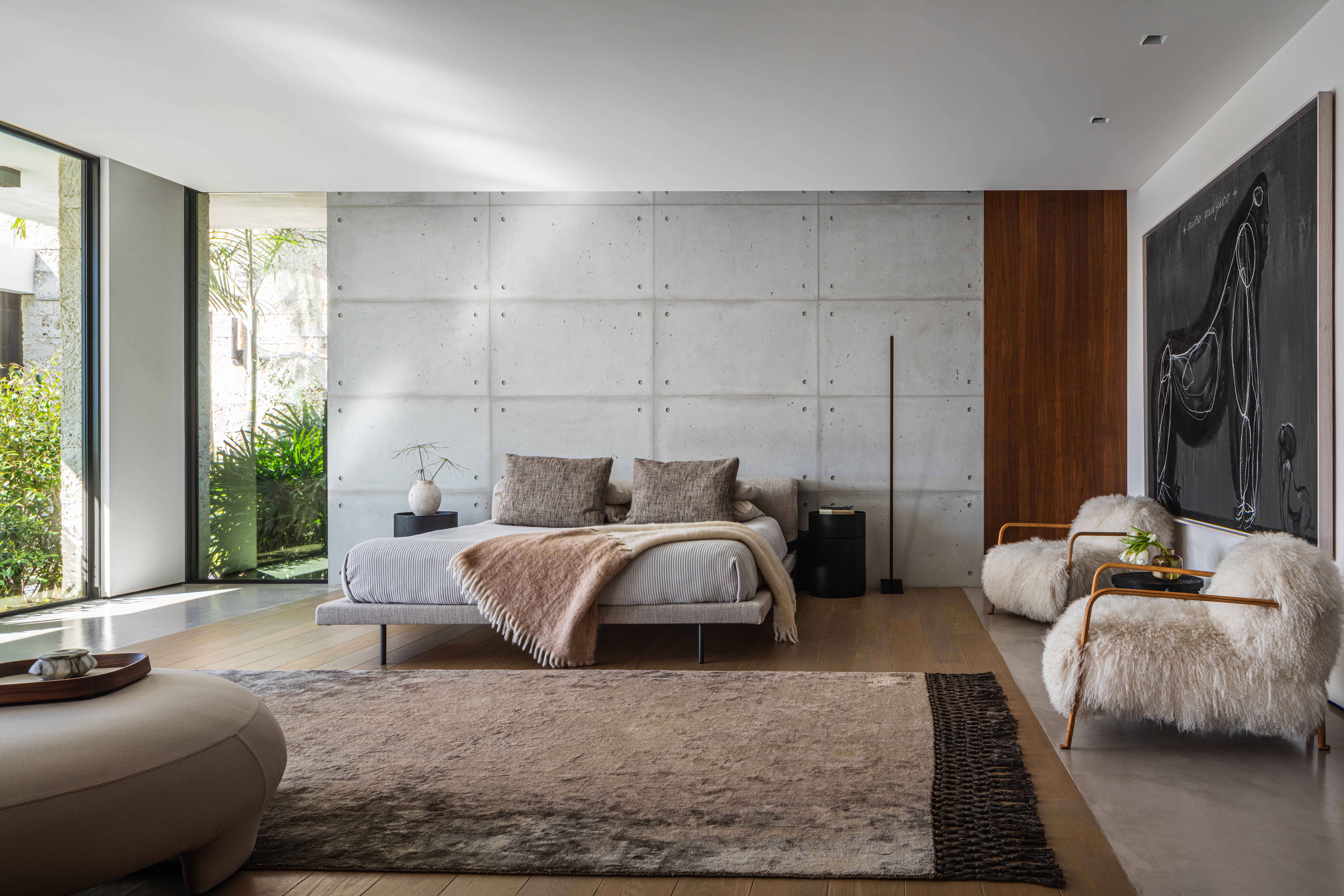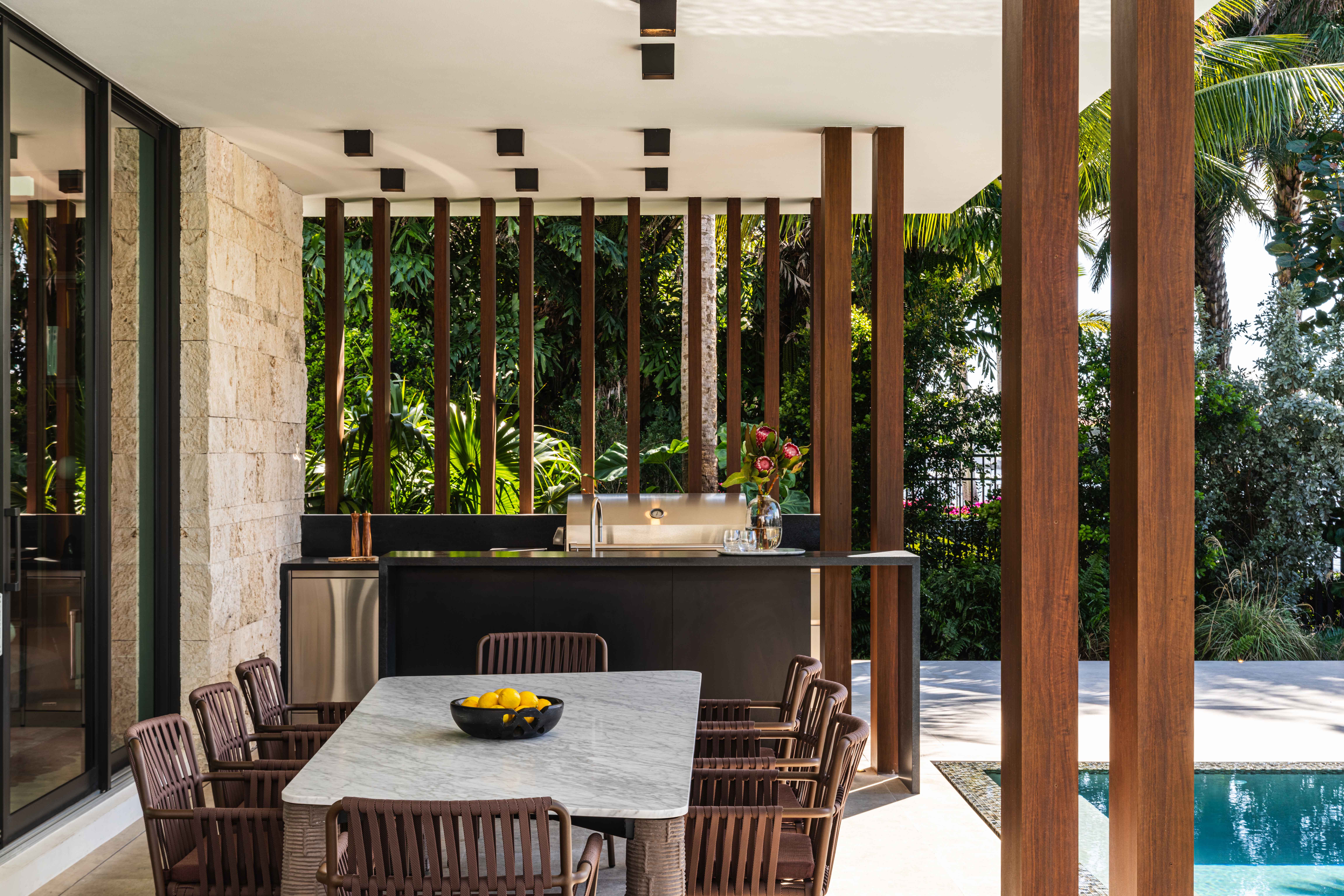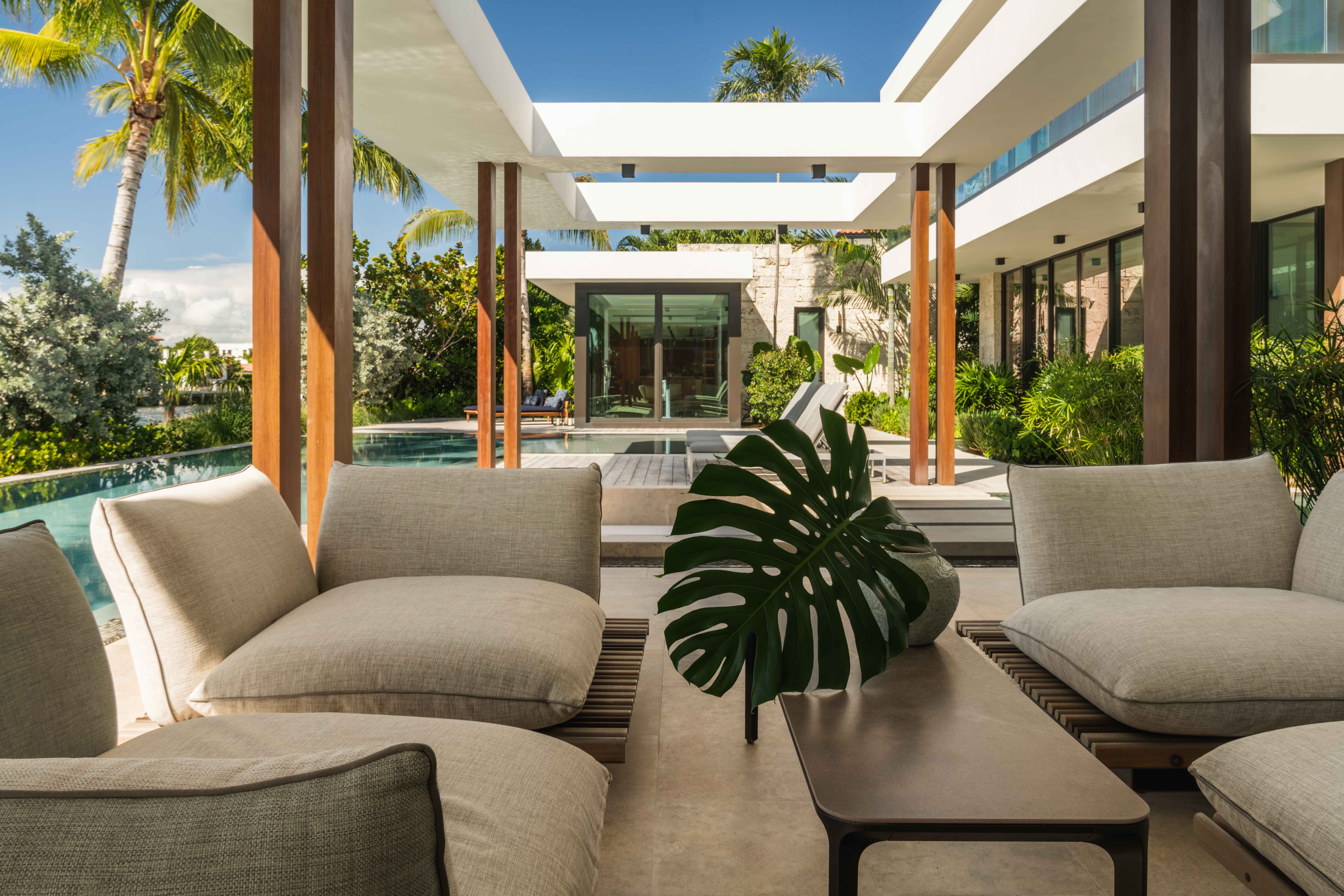 The F-shaped pool and sunken sitting area provide seclusion from passing boats while maintaining clear sightlines to the water. What emerged proves that masculine doesn't have to mean cold, that even the most uncompromising modern vision benefits from layers, texture, and the strategic introduction of warmth.